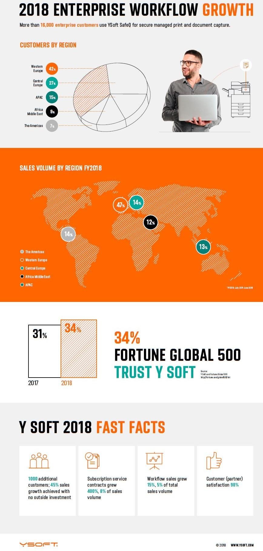 V infografice níže pak Y Soft nastínil regionální průlom tržeb a růst počtu zákazníků, stejně jako další zajímavé skutečnosti pro fiskální rok 2018.