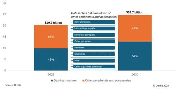Celkové výdaje na herní periférie a příslušenství v roce 2025 podle výzkumu společnosti Omdia celosvětově překročí 20 miliard dolarů. Do roku 2030 se pak tato částka přiblíží dokonce 25 miliardám USD.