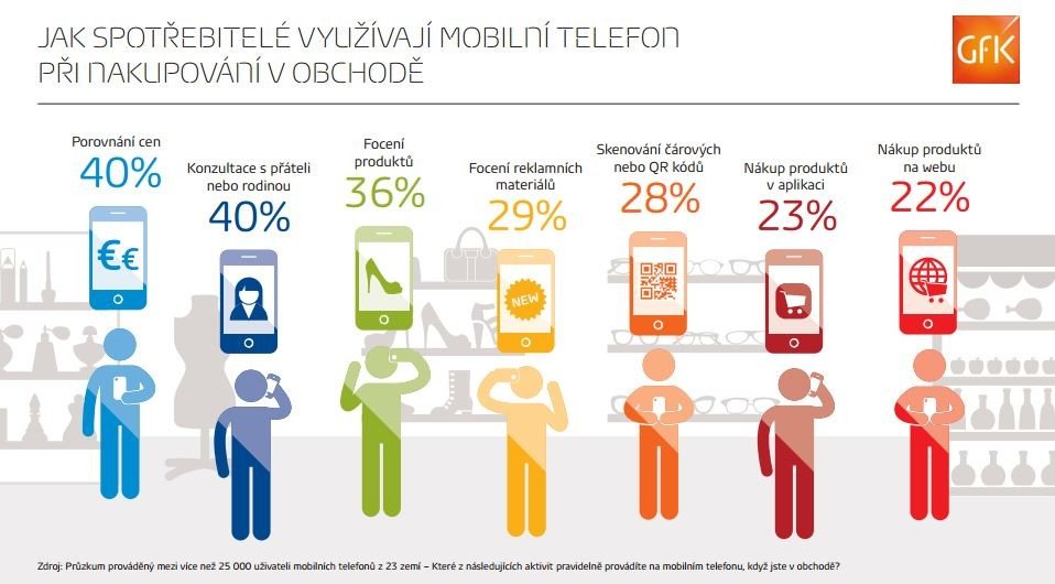 Společnost GfK se uživatelů mobilních telefonů z 23 zemí zeptala, jaké činnosti pravidelně provádějí na svém mobilním telefonu, když jsou v obchodě. Spotřebitelé nejčastěji porovnávají ceny a radí se přes telefon s přáteli či rodinou (shodně 40 %). Často si také fotí produkty, o jejichž koupi uvažují (36 %).