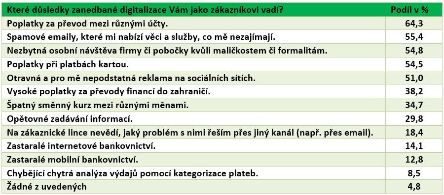 Za poslední rok udělala řada firem v digitalizaci a automatizaci svých služeb velký pokrok, přesto má většina z nich v této oblasti rezervy, které mají negativní vliv na jejich zákazníky. Z negativních důsledků zanedbané digitalizace nebo automatizace vadí lidem nejvíce poplatky za převod mezi účty, spamové e-maily, zbytečné návštěvy poboček a poplatky při platbách kartou.