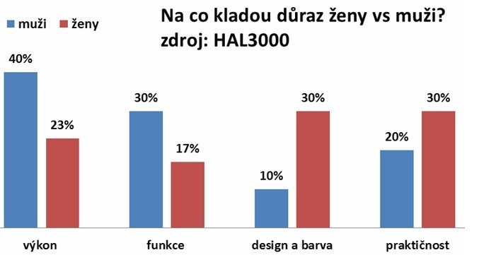 Jiné priority žen potvrzuje i psychologická studie neziskové organizace Color association, která vyhodnotila více než 100 tisíc profilů mužských a ženských respondentů: „Pro ženy je velmi důležitý i komunikačně sociální rozměr. Kromě funkčnosti jim proto záleží i na vzhledu a souladu s okolním prostředím,“ shrnuje závěry studie doktor Filip Brodan.