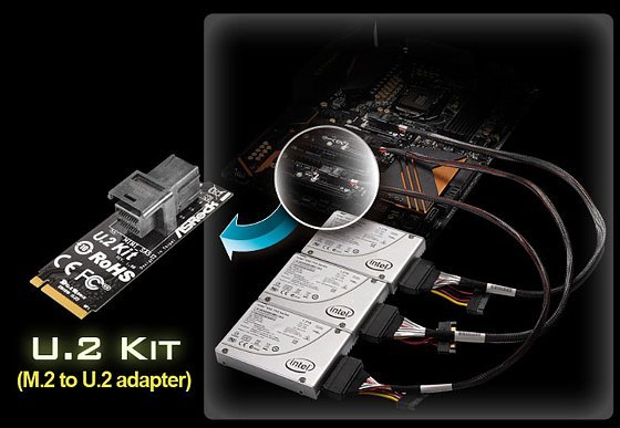 U.2 Kit – malá přídavná karta do slotu PCIe Gen3 x4 Ultra M.2, která vykouzlí podporu pro nejrychlejší SSD Intel série 750 včetně podpory pro RAID 0. A to je vážně fofr!