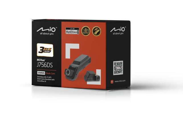• Balení: MiVue J756DS, zadní kamera T35, MiVue SmartBox III, cigaretová nabíječka, lepící držák, krytka kabeláže, 8metrový kabel k zadní kameře, návod.