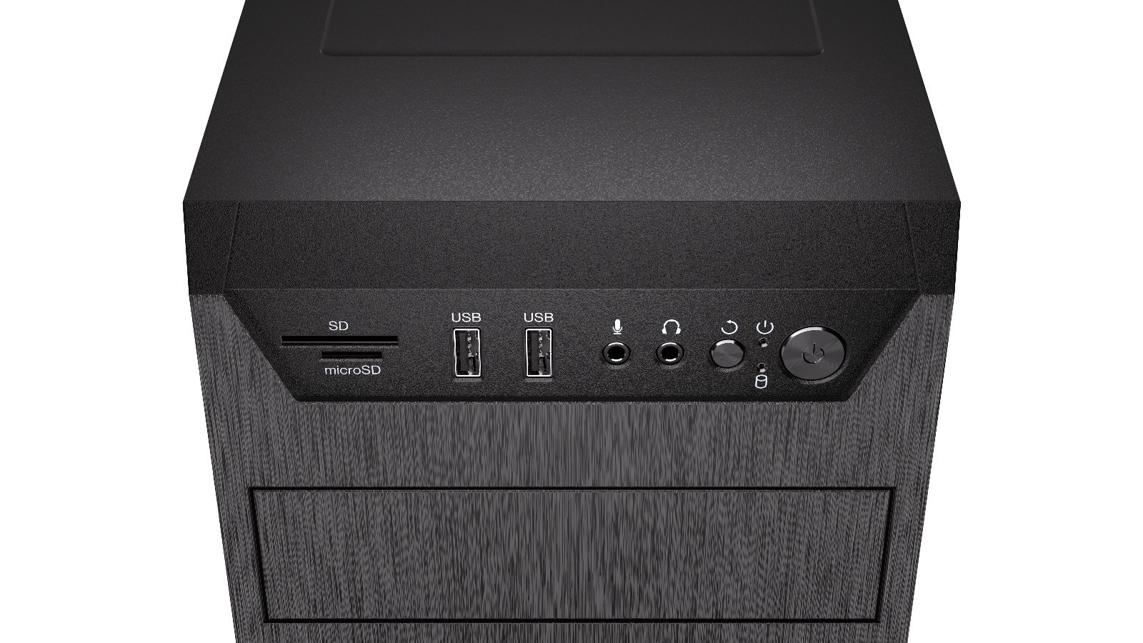 PC skříň obsahuje dva vestavěné USB-A konektory, 2x jack 3,5 mm pro headset (nebo pro mikrofon a reproduktory) a čtečku SD/microSD karet. Pro vaše pohodlí jsou všechny umístěny na předním panelu Armis 100 Solid.
