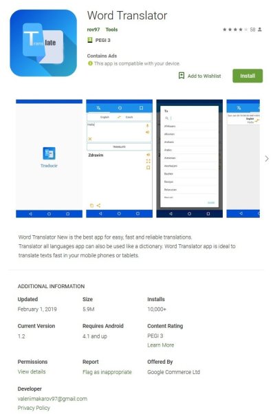 Bezpečnostní analytici společnosti ESET upozorňují na další rizikovou aplikaci, která byla k dispozici v oficiálním obchodě Google Play. Nástroj pro překládání textů Word Translator byl pro uživatele hrozbou, která umožňovala útočníkům vzdálený přístup do bankovního účtu napadeného uživatele. Útočníci znovu cílí především na klienty bank působících v České republice, kterým mohli zcizit přihlašovací údaje. Díky rychlé a koordinované aktivitě společnosti ESET a bankovních domů došlo k rychlé detekci a nastavení účinných opatření. Aplikace před odstraněním z obchodu Google Play měla více než 10 tisíc stažení.