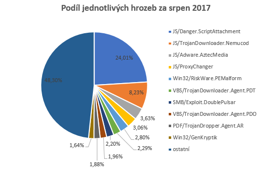 Český internet v srpnu zaplavila nová vlna nebezpečných e-mailových příloh, které ESET detekuje jako JS/Danger.ScriptAttachment. Z výsledků pravidelné měsíční statistiky společnosti ESET vyplývá, že tento typ škodlivého kódu v srpnu představoval téměř každou čtvrtou detekovanou hrozbu. Dlouhodobě jde o nejčastější kybernetické nebezpečí, kterému čelí čeští uživatelé internetu. Oproti červenci podíl JS/Danger.ScriptAttachment na celkových hrozbách vzrostl o 6,5 procentního bodu na 24,01 procenta.
