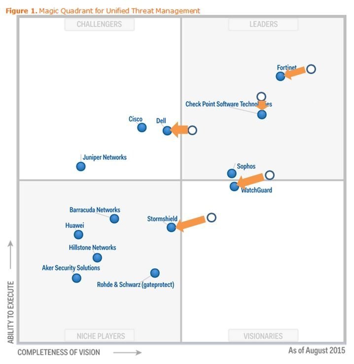 Analytická společnost Gartner zveřejnila nový Magic Quadrant report pro UTM technologie na rok 2015. Z reportu vyplývá, že pro mnohé výrobce UTM řešení není snadné udržet tempo se soudobými trendy. Dosavadní dlouholeté lídry WatchGuard a SonicWall zatlačila jejich sestupná tendence "pod čáru" a v pravém horním rohu tak zůstává pouze Sophos, CheckPoint a Fortinet.