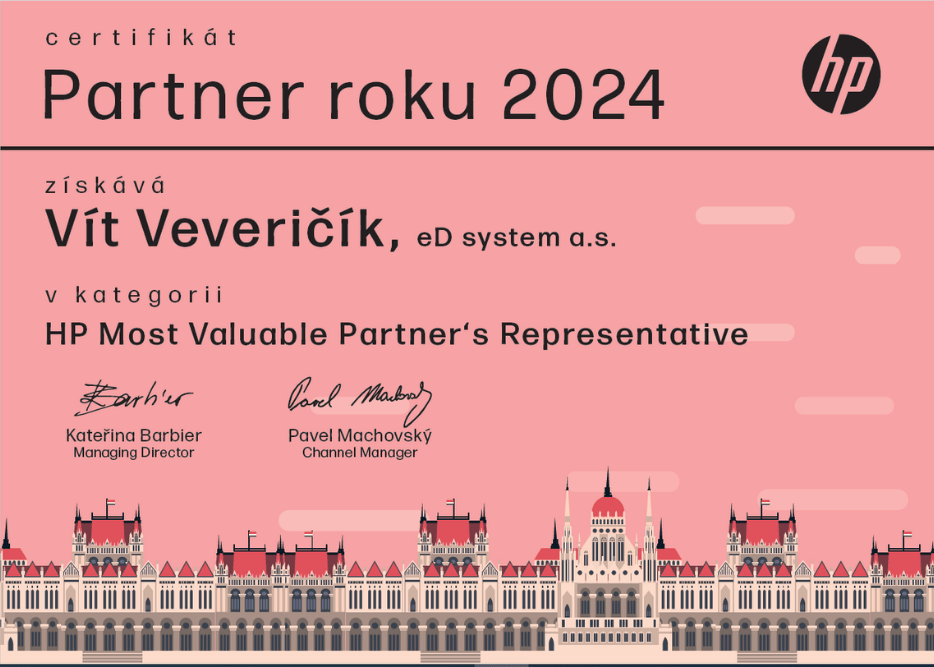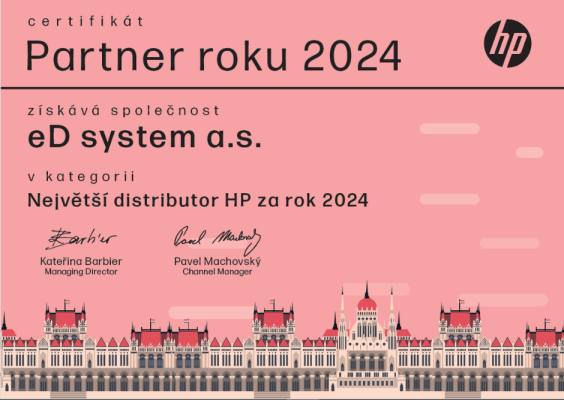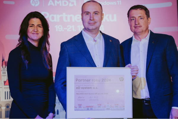 Mezi oceněnými stanul po roce opět eD system. Ten si drží prvenství v kategorii Největší distributor HP již patnáct let v řadě. Titul získal za největší obraty v Česku za rok 2024 a z rukou zástupců značky Kateřiny Barbier (Managing Director Czech Republic, Slovakia and Hungary) a Pavla Machovského (Country Channel Sales Manager) jej převzal výkonný ředitel eD Šimon Churý.
