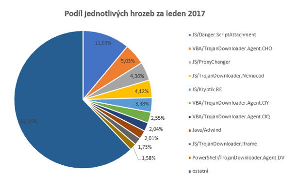 Druhou nejčetnější lednovou hrozbou v Česku byl zástupce výše uvedené rodiny, konkrétně pak VBA/TrojanDownloader.Agent.CHO, který představoval 5,03 procenta zachycených případů. Na třetí pozici se dostal malware Changer, který ESET detekuje jako JS/ProxyChanger. Tento škodlivý kód umožňuje přesměrovat legitimní požadavek na útočníkem nastrčenou stránku a získat tak například číslo kreditní karty oběti. Changer stál za 4,36 procenty případů zjištěných internetových útoků v Česku.