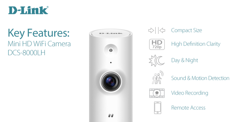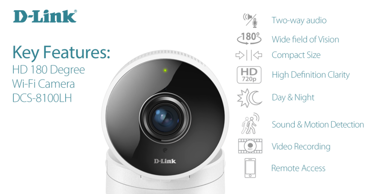 Kamera DCS-8000LH nabízí HD rozlišení, zorný úhel 120° a miniaturní rozměry, ideální pro položení na poličku. Kamera DCS-8100LH nabízí HD rozlišení s unikátním panoramatickým 180° úhlem záběru a slotem pro microSD kartu (max. 128GB). Lze položit na poličku nebo přišroubovat na zeď či strop. IR přísvit u obou kamer zajišťuje noční vidění do 5m.