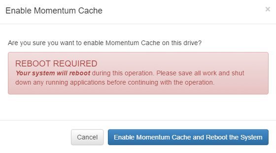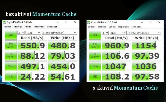 Nás ale zajímá záložka Momentum Cache, která dokáže s rychlostí SSD opravdu divy. Sliboval jsem, že to bude na dvě kliknutí. První je na záložku Momentum Cache a druhé na tlačítko „enable“, potom proběhne nezbytný restart a můžete si užívat rychlosti, jakým se SATA SSD ani nezdálo.