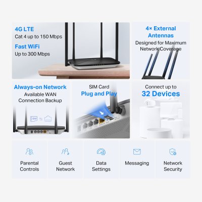 Novinka umožňuje jednoduše sdílet internetové připojení s rychlostí Wi-Fi až 300 Mb/s v pásmu 2,4 GHz pro až 32 zařízení. Díky podpoře 4G LTE technologie dosahuje rychlosti stahování až 150 Mb/s a odesílání až 50 Mb/s. Tato rychlost je dostatečná pro běžné používání internetu, včetně streamování videa nebo nenáročných online her. Do těla routeru stačí vložit nanoSIM kartu s vhodným datovým tarifem a zařízení je připraveno k použití bez nutnosti složité konfigurace.
