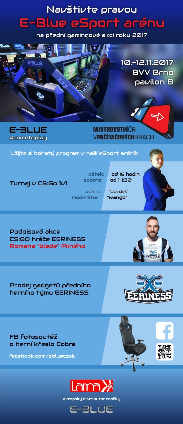 Nezapomeňte navštívit pavilon B a E-Blue eSport arénu na brněnském výstavišti ve dnech 10. - 12. 11. 2017.