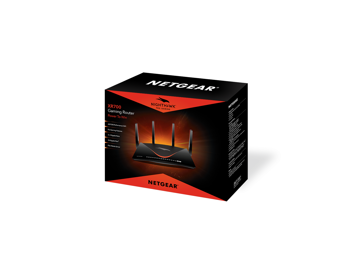 Špičkový výkon routeru NETGEAR Pro Gaming XR700 zajišťuje čtyřjádrový 1,7GHz procesor s operační pamětí 512 MB, technologie MU-MIMO, QoS, Beamforming+, Smart Roaming a Wi-Fi standard AD7200 s bezdrátovým připojením o rychlosti až 7,2 Gb/s (800 Mb/s ve 2,4GHz pásmu, 1 733 Mb/s v 5GHz pásmu a 4 600 Mb/s v 60GHz pásmu). Široké pokrytí mají na starosti čtyři externí antény Active se zesilovači, jež vedle běžného přenosu Wi-Fi signálu z připojeného zařízení směrem k routeru tento signál dále zesilují a minimalizují tak případný okolní šum. Součástí routeru je také šest gigabitových LAN portů s možností vzájemné agregace dvou z nich, jeden 10gigabitový LAN port SFP+ a dva USB porty 3.0.