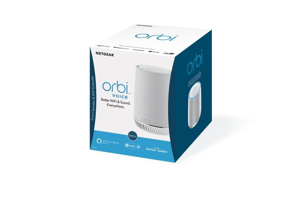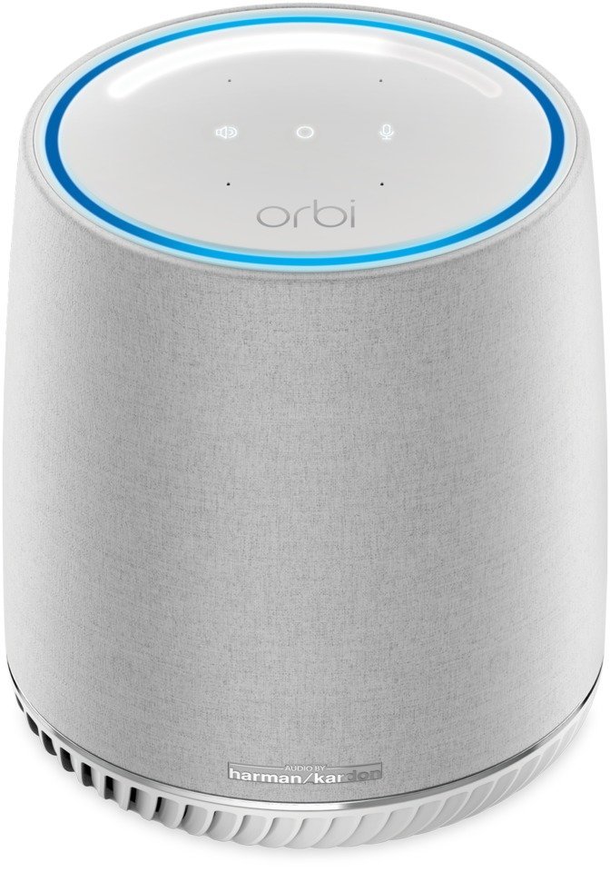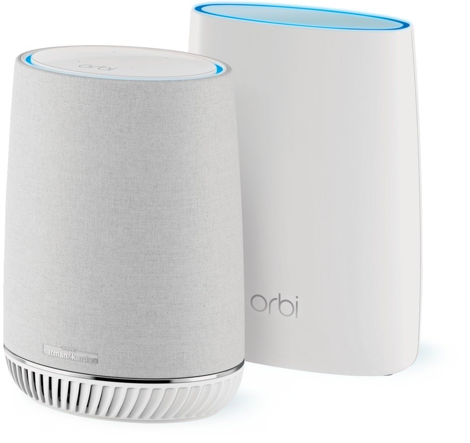- Satelit Orbi Voice (AC2200) se čtyřmi interními anténami, čtyřmi mikrofony, audiosystémem Harman Kardon, hlasovým asistentem Amazon Alexa a dvěma gigabitovými ethernetovými porty.