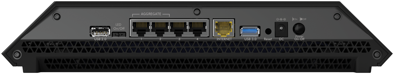 Wi-Fi router R8000P je vybaven pěti gigabitovými ethernetovými porty (4x LAN, 1x WAN), přičemž dva z nich lze v porovnání s předchozím modelem vzájemně agregovat a dosáhnout tak dvojnásobně vyšší přenosové rychlosti. Součástí zařízení je také dvojice USB portů (1x USB 3.0, 1x USB 2.0) nabízející snadný a rychlý přístup k externím datům.