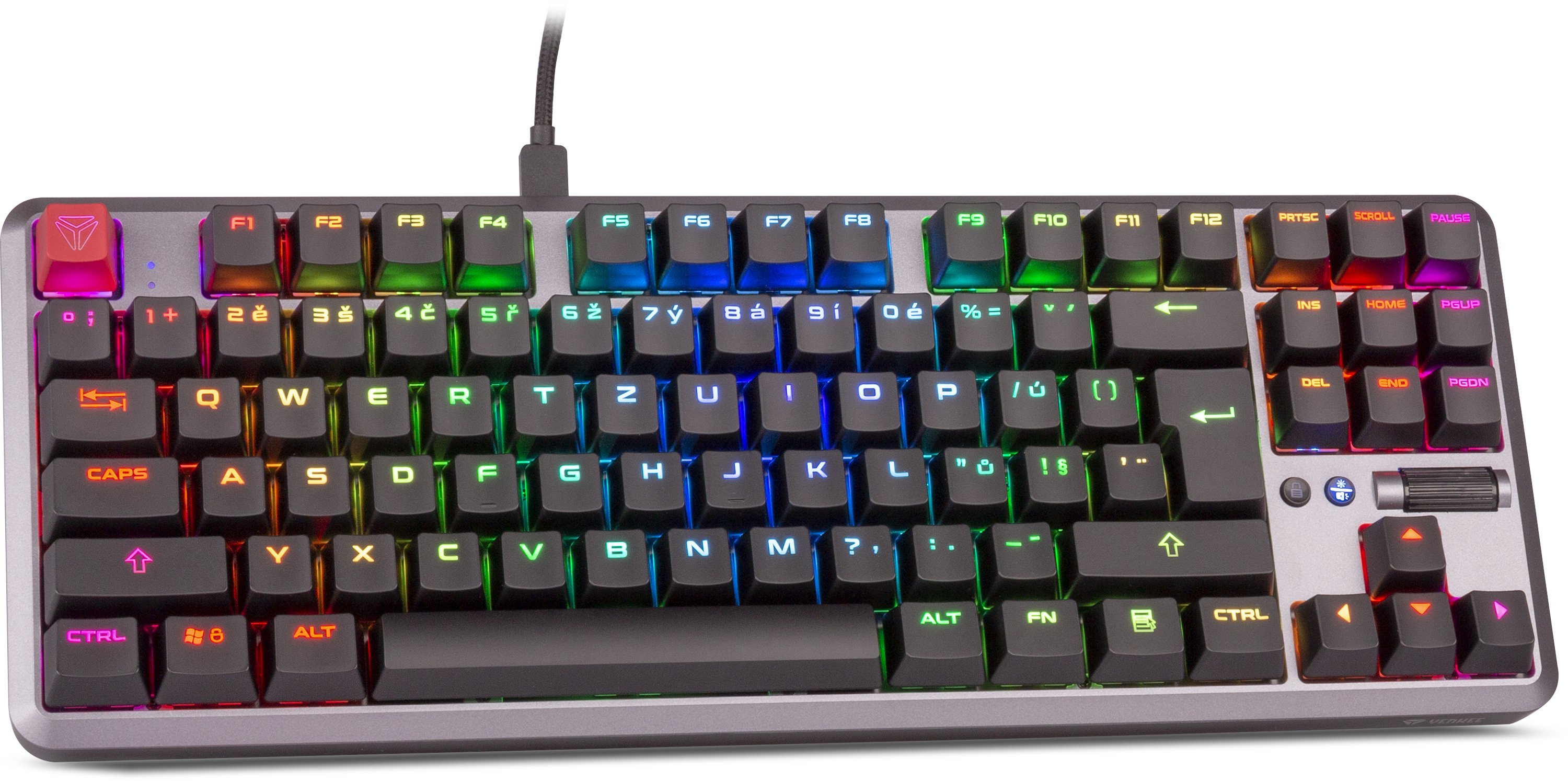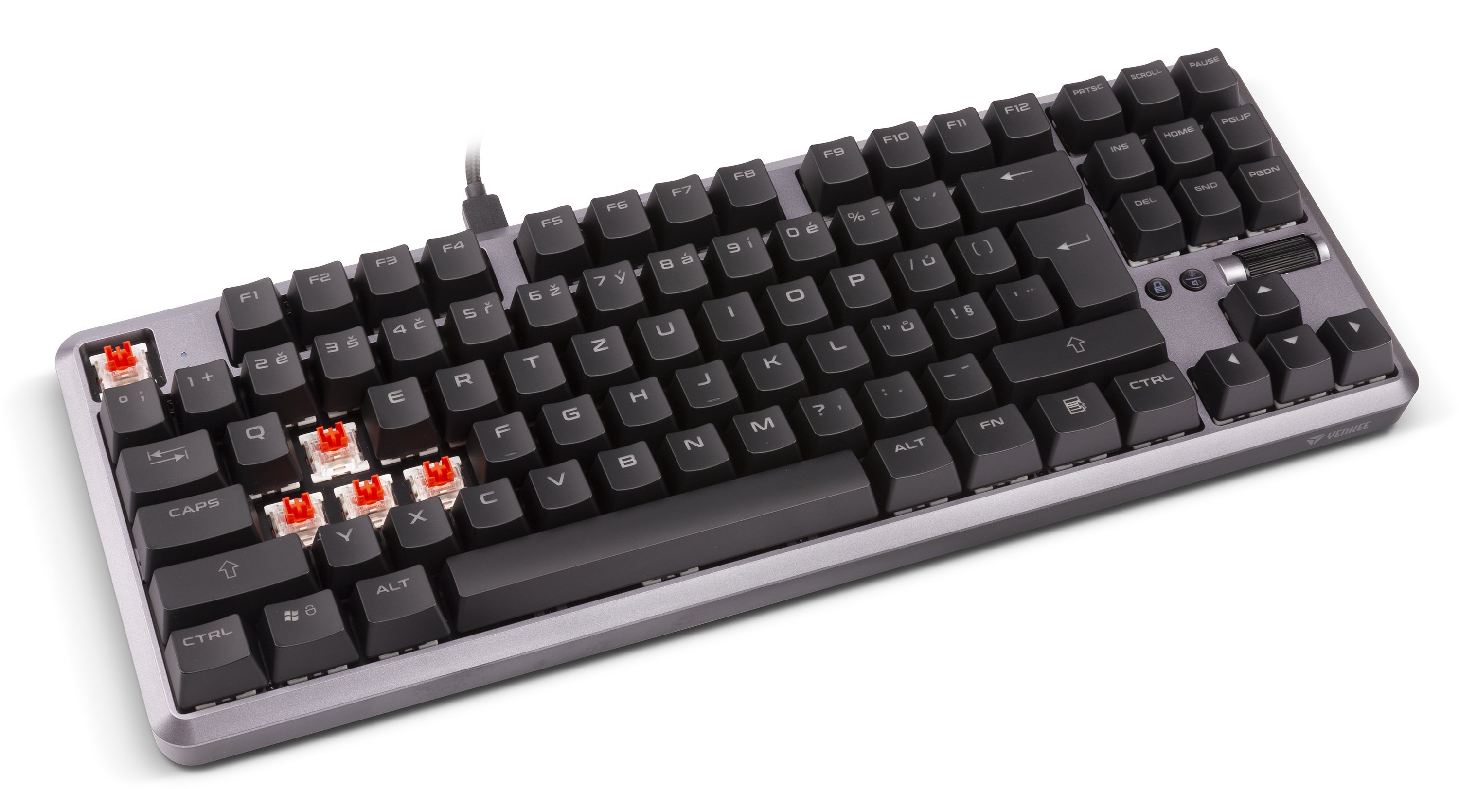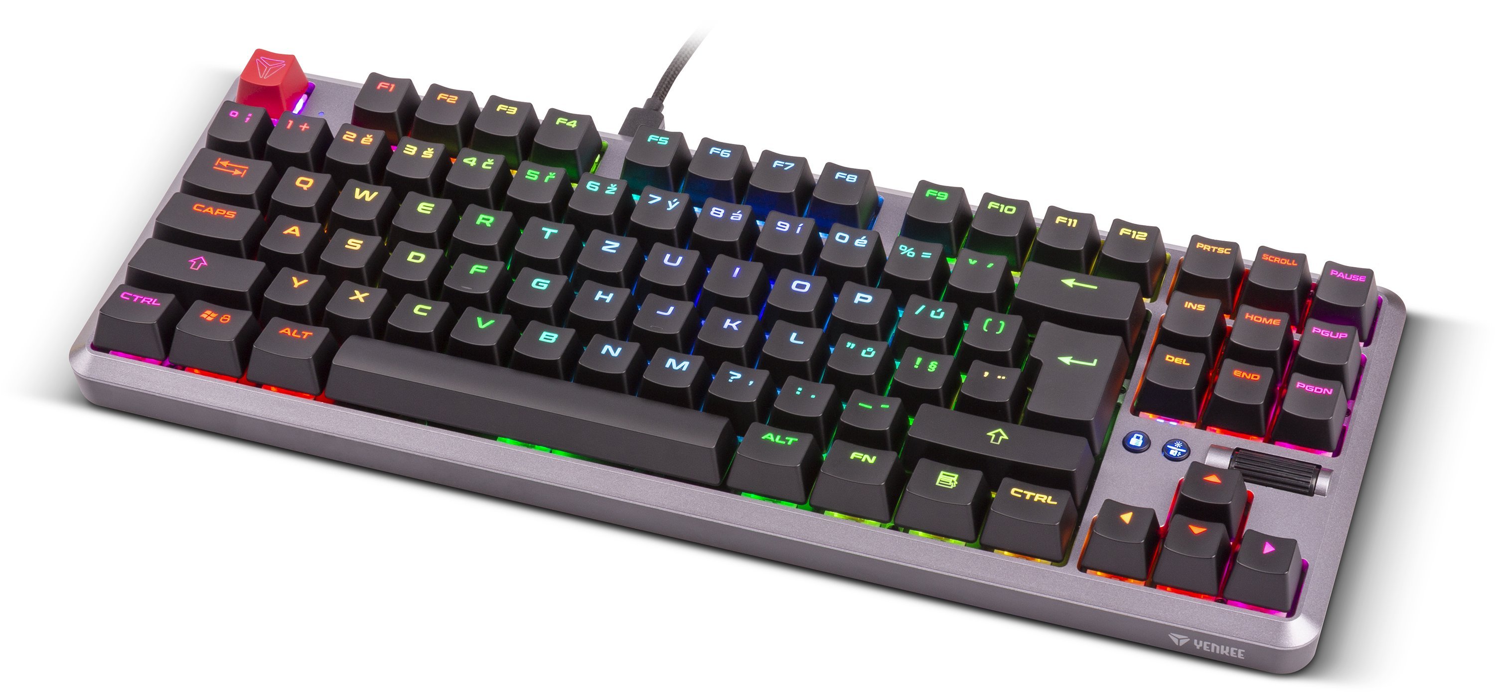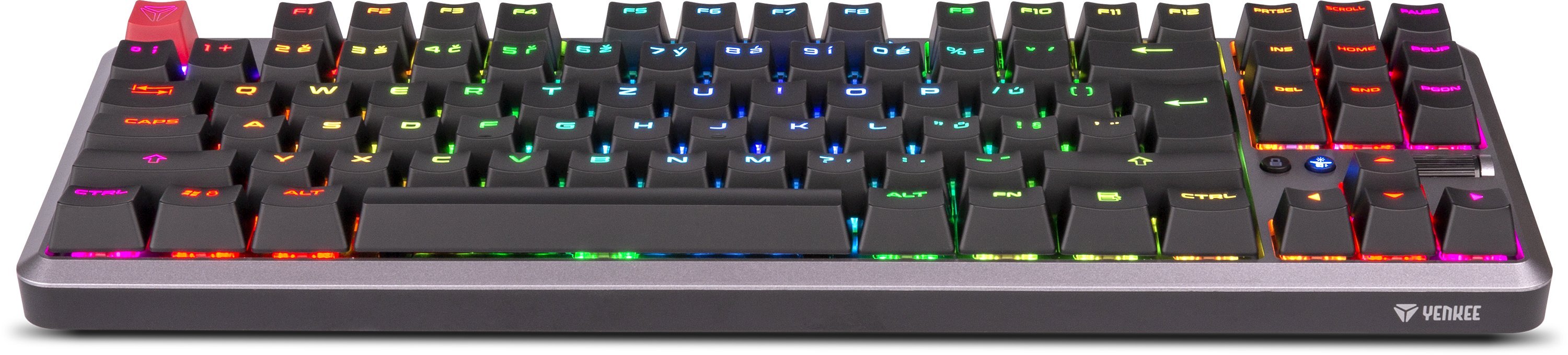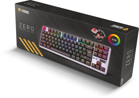 Mechanická klávesnice Zero je dalším kusem v řadě mechanických klávesnic značky YENKEE. Po modelech Panzer, Katana a kompaktním Atomu přichází nyní výrobce s modelem, který má za vyplnit mezeru mezi velkými klávesnicemi s numerickým blokem a tzv. mini. Zero tak nedisponuje numerickým blokem, ale směrové klávesy a funkční klávesy jako End či Del se na ní již nachází.