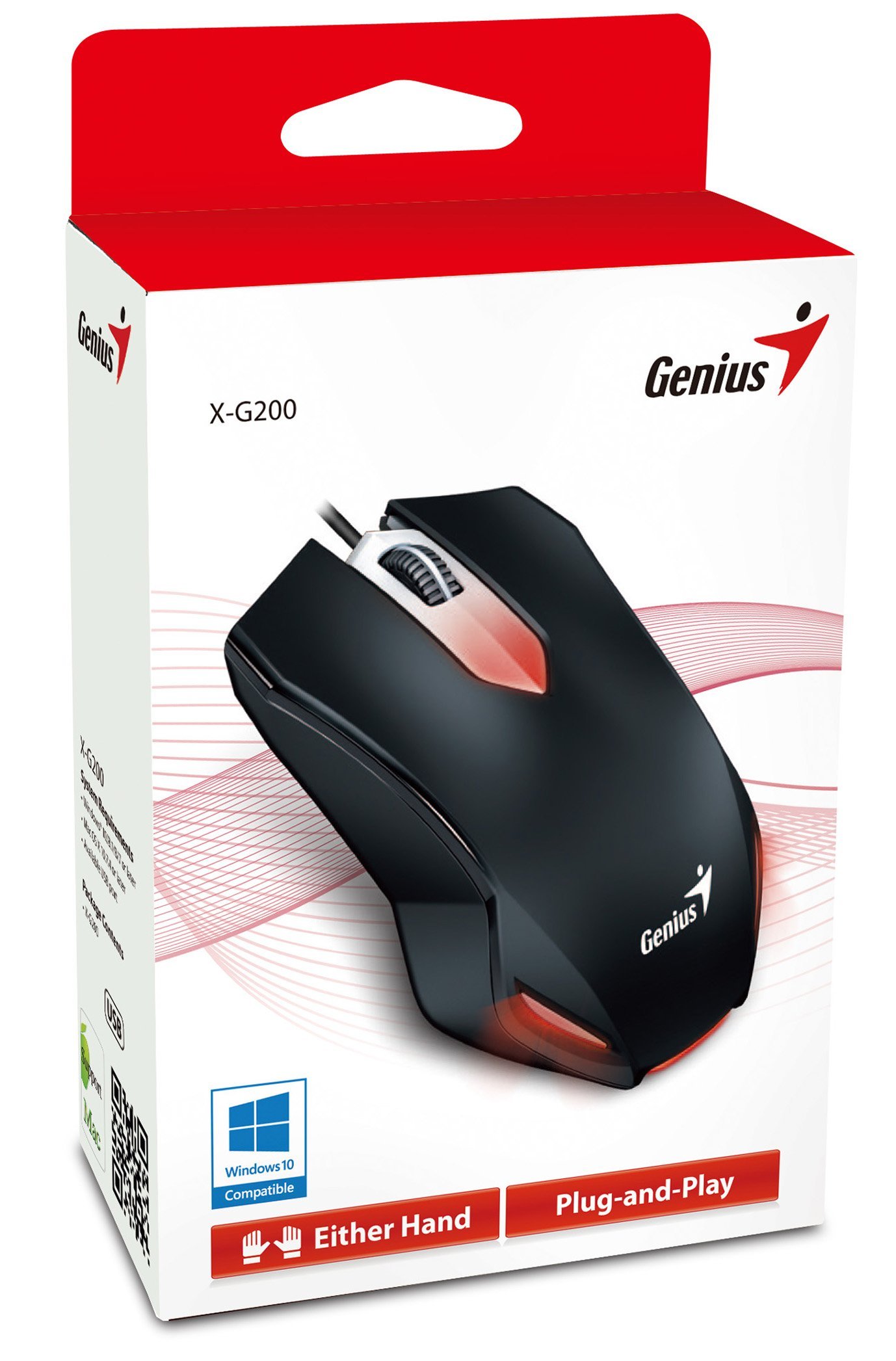 Myš Genius X-G200 je vybavena optickým senzorem s rozlišením 1000DPI, dvěma tlačítky a scrollovacím kolečkem s funkcí třetího tlačítka. Připojení je zprostředkováno pomocí 1,5m dlouhého kabelu zakončeného USB konektorem. Myš podporuje jednoduché Plug-n-play a je kompatibilní se všemi současnými operačními systémy Windows a MAC včetně nejnovějších Windows 10.