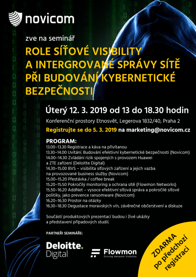 Novicom pořádá další odborný seminář, který se uskuteční v úterý 12. 3. 2019 v Praze a nese název „Role síťové visibility a integrované správy sítě při budování kybernetické bezpečnosti“.