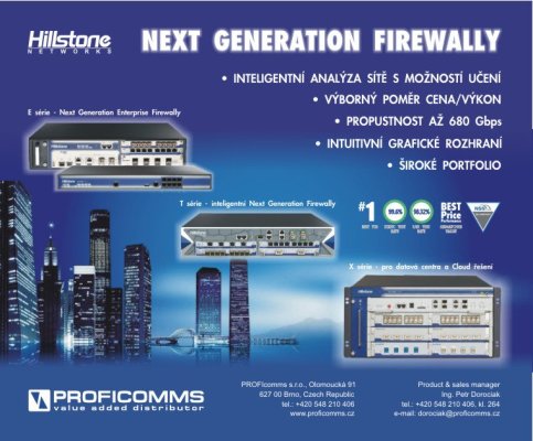 Společnost PROFIcomms se stala autorizovaným distributorem firewallů americké společnosti Hillstone Networks pro ČR a SR. Nabídka produktů a příslušenství Hillstone je velmi široká a dokáže uspokojit jak nároky středních a malých podnikových sítí tak i nejnáročnější požadavky na zabezpečení velkých firemních sítí či datových center - a to na úrovni hardwarové ochrany, virtuálního firewallu, či cloudového řešení.