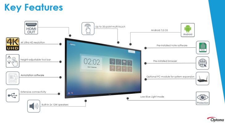 Multi-dotykové interaktivní panely Optoma se mohou pochlubit rozlišením 4K UHD (Ultra HD 4K rozlišení - s více než osmi miliony pixelů přináší čtyřikrát více detailů než Full HD, čímž poskytuje ostřejší snímky s reálnější podobou a bohatší barvy. To umožní sedět blíže k obrazovce a užívat si pohlcující zážitek. Displej dále disponují tzv. multi-touch funkcí umožňující 20 současných dotyků, což přináší možnost jednoduchého vytváření skupinové práce, sdílení podkladů, nápadů a řešení ve škole i firemním prostředí. Displej je vybaven tvrzeným sklem, modrým světelným filtrem a širokými pozorovacími úhly.