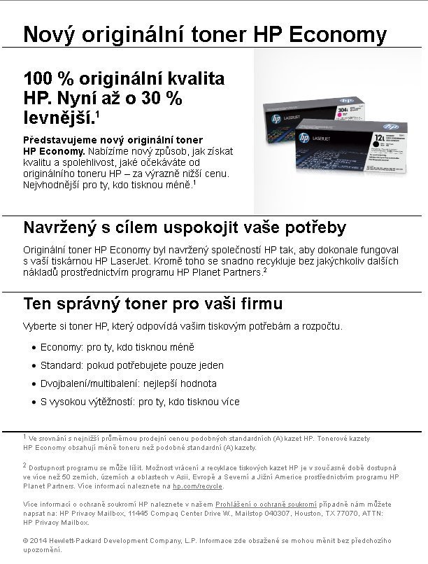 Společnost Hewlett-Packard představila nové originální tonery HP Economy, které nabízejí nový způsob, jak získat kvalitu a spolehlivost, jaké očekáváte od originálního toneru HP – za výrazně nižší cenu.