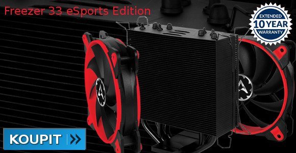 Máte-li spadeno na pořádné chlazení, zvažte řadu ARCTIC Freezer 33 eSports Edition. eSports edice disponuje – oproti původnímu modelu – vyšší chladící kapacitou až 210 W s maximem 320 W, snadno si tak poradí i s nejvýkonnějšími procesory. Novinkou je i rozmístění heat-pipe trubiček, které jsou umístěny mimo centrální část základny a přebytečné teplo se tak rozvádí výrazně lépe. K dispozici je varianta se dvěma ventilátoryBioniX s PWM technologií, které pohání 3fázový motor s dlouhou životností nebo varianta s ventilátorem jedním. I v případě designu má výrobce co nabídnout. K dispozici jsou hned čtyři barevná provedení: červené, zelené, bílé a žluté. Uživatel si tak může vybrat přesně podle svých preferencí a sladit tak masivní chladič se zbytkem komponentů.