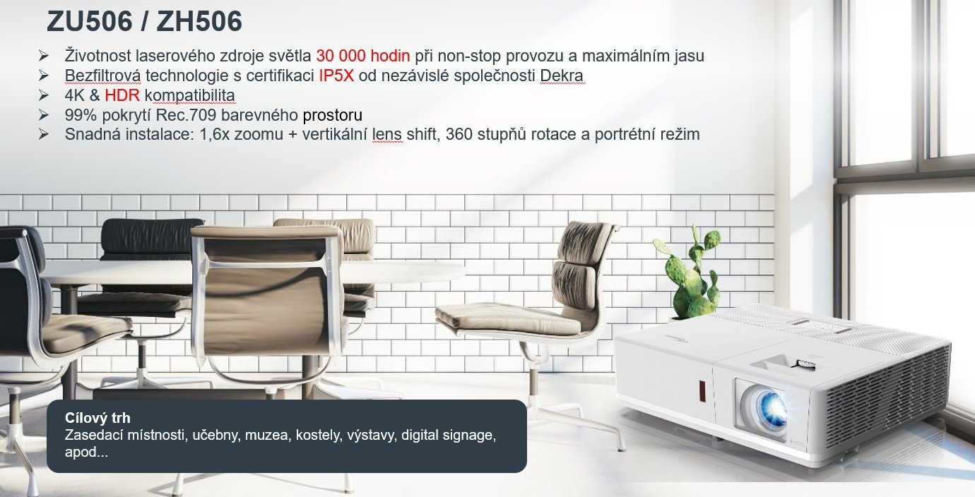 ZU506 a ZH506 mají rozlišení WUXGA a Full HD 1080p, mohou se pochlubit jasem 5000 lumenů a nabízejí flexibilní instalaci s velkorysým zoomem, vertikálním posunem objektivu a čtyřbodové nastavení hran obrazu - ideální pro nerovnoměrné stěny nebo tam, kde je umístění projektoru krkolomné a je nutná instalace pod úhlem.