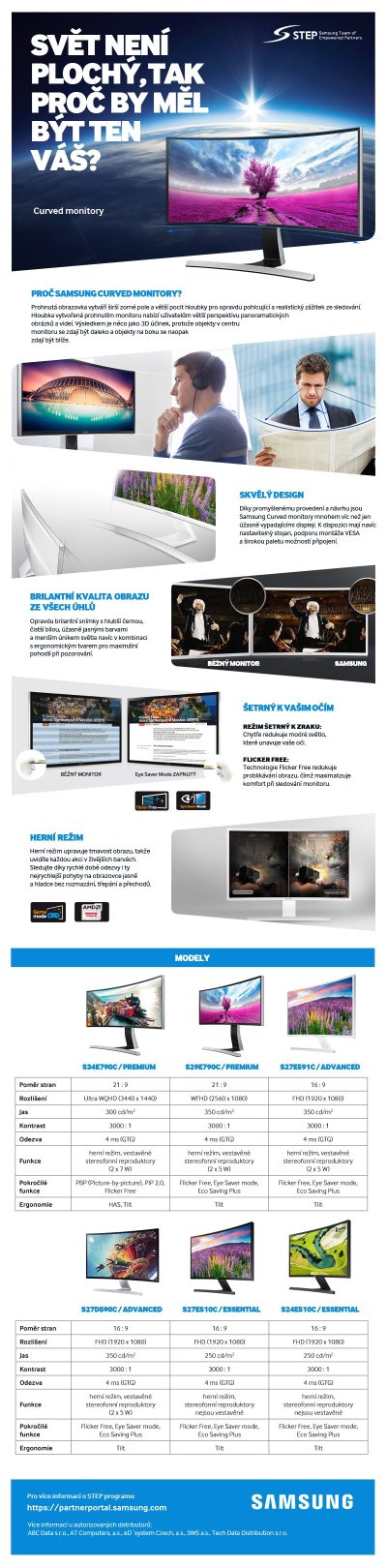 Svět není plochý, tak proč by měl být ten váš? Prozkoumejte Samsung Curved monitory kliknutím na obrázek v galerii a nechte se obklopit špičkovou kvalitou obrazu.
