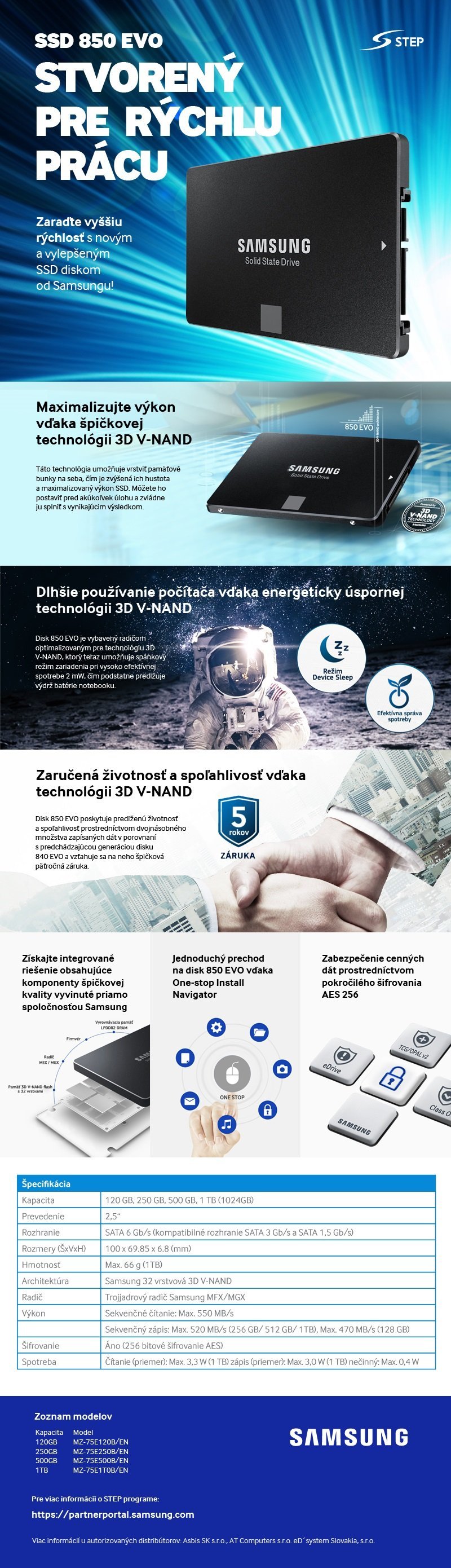 Zařaďte vyšší rychlost s novým a vylepšeným SSD diskem od Samsungu! Pro více informací o SSD 850 EVO a jeho vlastnostech klikněte na fotogalerii níže.