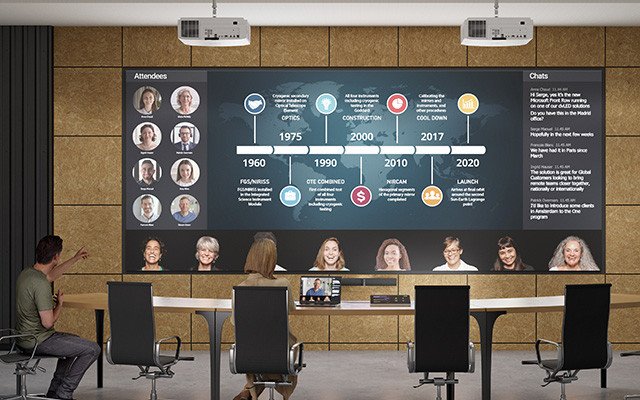 Laserová projekce, která se znovu objevuje v zasedacích místnostech, poskytuje velký, jasný a škálovatelný obraz v rozlišení bez pixelů. Použitím dvou nebo více projektorů vedle sebe můžete dosáhnout mimořádné šířky a ideálního poměru stran pro preferované uspořádání video konferencí, ať už se jedná o MTR Front Row nebo jakoukoli jinou platformu či uspořádání. Projekce je navíc diskrétní (žádné černé obrazovky, když se nepoužívá), cenově výhodná a všestranná.
