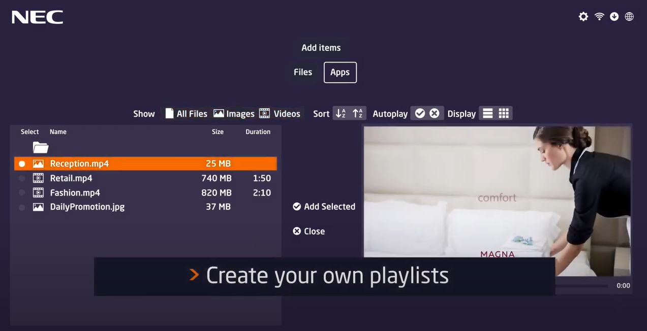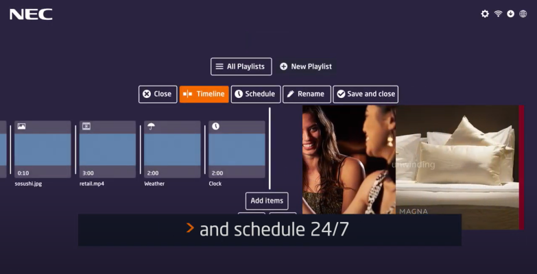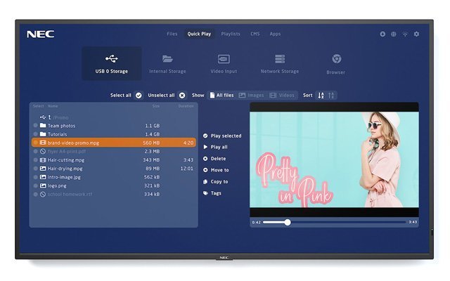Základem přehrávače NEC MediaPlayer je jednoduchost. Bez ohledu na předchozí zkušenosti se signage systémy umožňuje řešení NEC uživatelům dosáhnout zajímavého přehrávání obsahu během několika minut po zapnutí: