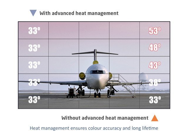 Jedinečný systém tepelného managementu a kovová konstrukce skříně účinně odvádějí teplo, zajišťují dlouhou životnost a stálý výkon. Sotva znatelné mezery v obraze a možnost kalibrace dosahují homogenního vizuálního vnímání povrchu.