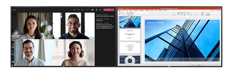75-palcový prostorový systém duálních obrazovek NEC kombinuje dva displeje, interaktivní NEC MultiSync® M751 IGB a identicky navržený neinteraktivní nedotykový displej MultiSync® M751 IGB do komplexního uživatelsky přátelského systému. Ideálně se hodí na zařízení prostoru pro setkání a spolupráci, ať už pro týmová setkání s plnou přímou účastí nebo hybridní setkání. Svým elegantním a vkusným designem se řešení displeje bezproblémově hodí do moderních kancelářských prostorů. Neinteraktivní displej je vybaven stejným ochranným skleněným panelem jako dotykový displej, což jim dává stejný vizuální vzhled.