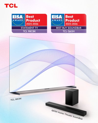 V čele letošního úspěchu stojí obří 98palcový TCL C8K, který získal ocenění „EISA STATEMENT TV 2025–2026“ za design bez kompromisů a dechberoucí velkoformátový obraz. Model TCL 85C9K si odnesl titul „EISA HOME THEATER MINI LED TV 2025–2026“ a nastavil vysokou laťku pro domácí kina a filmové zážitky. TCL 75C7K získal ocenění „EISA FAMILY TV 2025–2026“ za vyváženou kombinaci brilantního obrazu a chytrých funkcí a TCL 55C6K si vysloužil „EISA GAMING TV 2025-2026“ – je jasnou volbou pro vlastníky konzolí nové generace. Pětici ocenění uzavírá soundbar TCL Q65H, oceněný jako „EISA BEST BUY SOUNDBAR 2025–2026“, který za bezkonkurenční cenunabízí zvuk, který se vyrovná kinu.