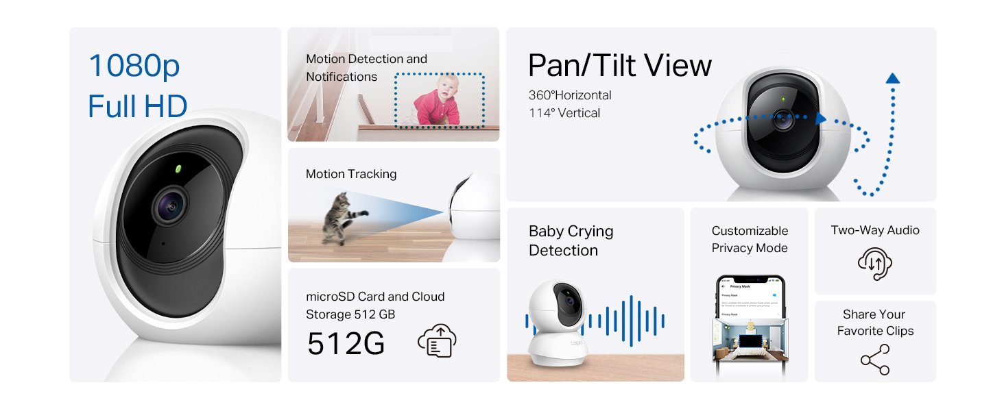 Nový model nabízí vynikající rozlišení 1080p s devítinásobným digitálním zoomem, což umožňuje zachytit každý detail s mimořádnou ostrostí a jasností. Kamera je vybavena funkcí horizontálního a vertikálního otáčení, poskytující široký úhel záběru až 360° horizontálně a 114° vertikálně. Díky tomu je možné monitorovat celý prostor v místnosti, aniž by bylo třeba instalovat více kamer.