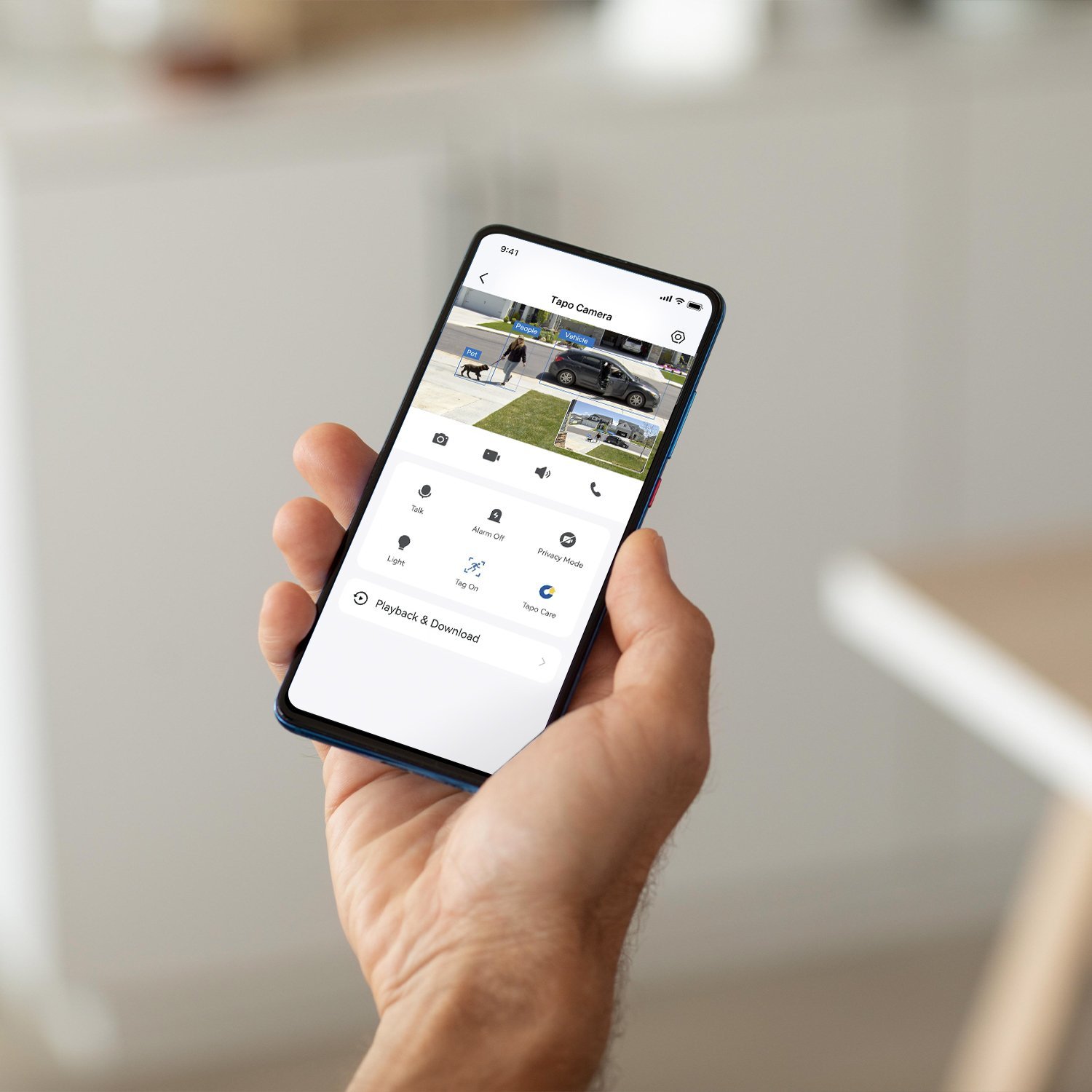 Aplikace Tapo umožňuje chytrý dynamický zoom, automatické sledování pohybu, nastavení zón aktivity, správu databáze obličejů i sdílení přístupu s rodinou. Kamera podporuje obousměrnou komunikaci, vlastní zvukové a světelné alarmy a hlasové ovládání přes Amazon Alexa a Google Assistant.