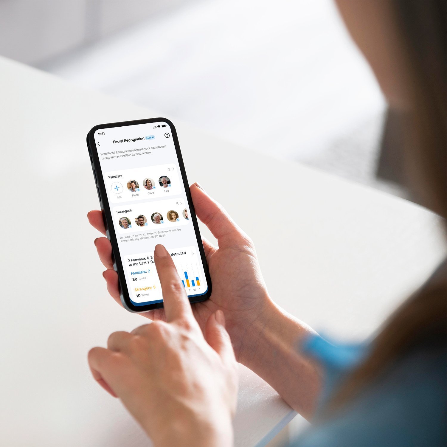 Kamera disponuje bezplatným AI systémem pro lokální rozpoznávání obličejů – dokáže odlišit cizí osoby, rodinu i přátele a umožňuje správu databáze známých tváří přímo v aplikaci. Umělá inteligence zdarma detekuje osoby, domácí mazlíčky i vozidla a zasílá upozornění pouze tehdy, když je to skutečně potřeba. Veškeré údaje o obličejích zůstávají zpracovány pouze lokálně, což zajišťuje maximální soukromí.