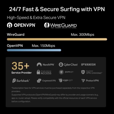 Router podporuje moderní bezpečnostní standardy včetně WPA3, které chrání síť před neoprávněným přístupem. K dispozici je také podpora VPN technologií OpenVPN a WireGuard, což umožňuje bezpečné vzdálené připojení k domácí nebo firemní síti.