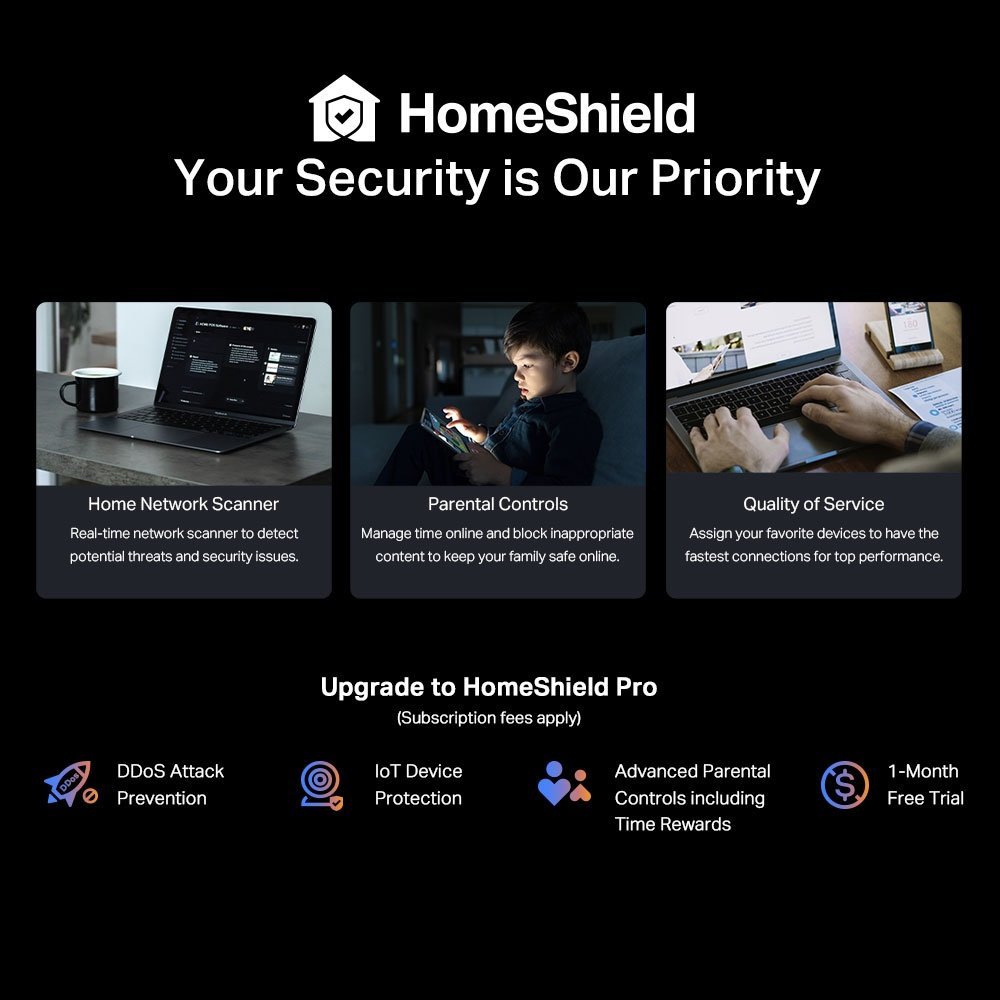 Archer BE900 poskytuje pokročilé zabezpečení prostřednictvím platformy TP-Link HomeShield, která chrání uživatele před nejnovějšími kybernetickými hrozbami. Tato technologie nabízí ochranu všem zařízením připojeným do sítě včetně IoT produktů.