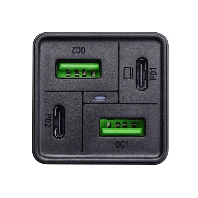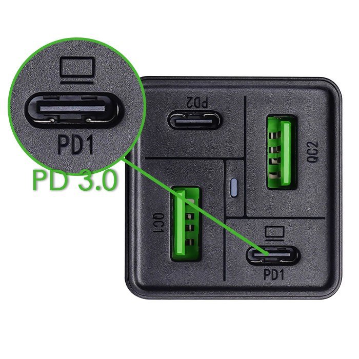 Dva porty USB typu C mají stejně užitečnou funkci. Vestavěný nabíjecí standard Power Delivery 3.0 zajišťuje bezpečné a rychlé nabíjení zařízení. Zařízení lze nabít během několika minut a vy tak ušetříte svůj čas! Navíc jednou z nejdůležitějších funkcí PD 3.0 je přizpůsobení parametrů nabíjení připojenému zařízení. Díky tomu může nabíječka dodávat větší výkon zařízením, jako jsou například notebooky.