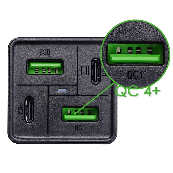 Nabíječka má dva zelené porty USB typu A, které poskytují výkon až 18 W. To znamená, že vaše zařízení budou nabita rychleji než kdykoli předtím! To vše díky podpoře rychlého nabíjení Quick Charge 4+, jeho předchůdců a dalších protokolů používaných v nejnovějších smartphonech značek, jako je Samsung (AFC), Huawei (FCP/SCP) a Apple (2,4 A). Navíc jsou porty USB-A kompatibilní s většinou mobilních zařízení. To znamená, že je můžete používat nejen k nabíjení smartphonů, ale také powerbank, čteček elektronických knih, přehrávačů mp3 a dalších zařízení.