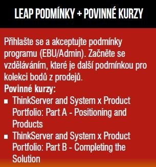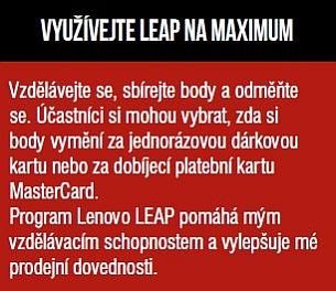 LEAP Specialist Program odměňuje prodejce a technické specialisty Lenovo obchodních partnerů za vzdělávání se a prodeje vybraných produktů Lenovo. Na portále LEAP jsou k dispozici komplexní nástroje pro vzdělávání a vylepšování produktových znalostí obchodníků Lenovo partnerů. Jedná se o kurzy produktů Lenovo System x, ThinkServer, Lenovo datová úložiště, síťové prvky a další kurzy pro produkty datacenter, za jejichž plnění obchodník získává LEAP body – tzv. Learn & Earn. LEAP body se sbírají také za prodej vybraných produktů – tzv. Sell & Earn – body pak lze proměnit za přednabitou kartu MasterCard a utratit tak odměnu za cokoliv.