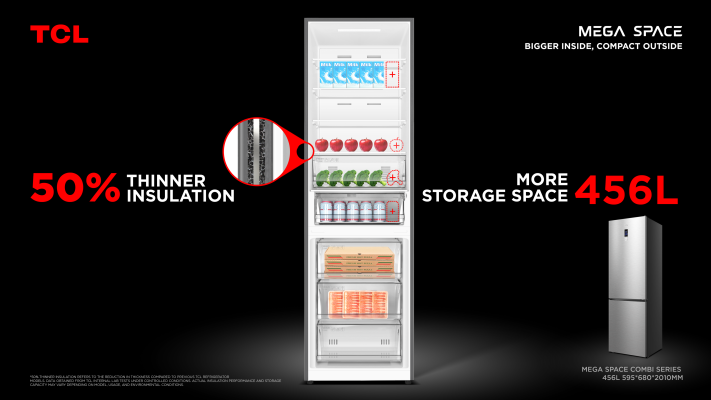 Modely Mega Space jsou třetí generací kombinovaných chladniček od TCL a pokračují v nastaveném trendu – lepší technologie a větší objem bez nárůstu velikosti spotřebiče. Díky vakuové izolaci (VIP – Vacuum Insulation Panel) nabízí tato lednice až o 74 litrů větší kapacitu než běžné modely stejné velikosti. Tato moderní technologie izolace totiž dovoluje ztenčit stěny lednice až o 50 %* a zajistit jim tak ultratenký profil– pouhých 30 mm. Výsledkem je chladnička s nadstandardním objemem 456 litrů, která v kuchyni zabírá stejné množství místa jako běžná kombinovaná lednice. Ideální spotřebič pro domácnosti, kde záleží na každém centimetru.