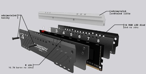 16 RGB LED diod v 8 zónách je to hlavní, čím se může novinka pochlubit. V současné době je to jediné řešení na trhu s takovou plejádou diod. Osm zón je osm pozic na vrchní straně modulu paměti a každá strana obsahuje osm diod, tedy celkem šestnáct na modul. Protože lze každou diodou prohnat 16,7 milionu barev, dovedete si představit ten cirkus.