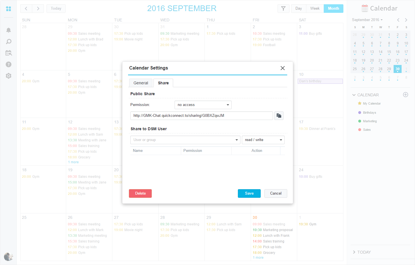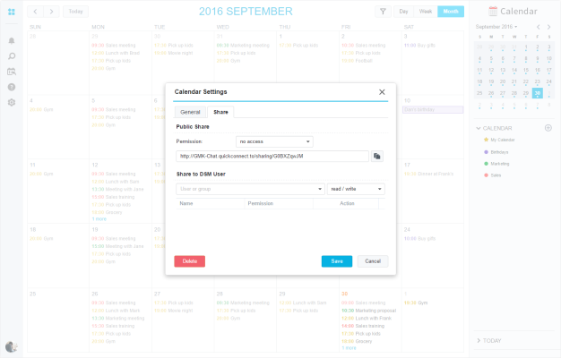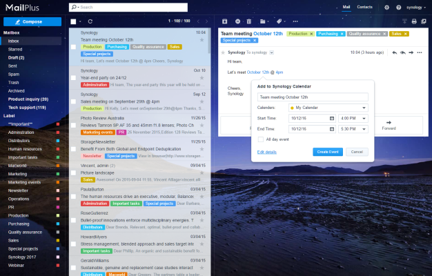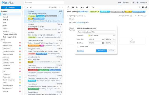 Sdílejte kalendáře, organizujte jednání a přidávejte nové události přímo v MailPlus. Calendar je součástí Synology NAS, takže citlivé firemní údaje zůstanou bezpečně uložené v rámci firmy. Získejte více informací o balíčku Calendar.