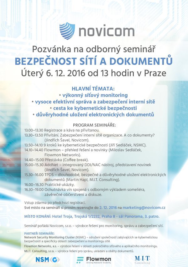 Společnost Novicom zve na další z řady svých odborných seminářů, které pořádá zejména v Praze. Prosincový seminář nese název "Bezpečnost sítí a dokumentů".