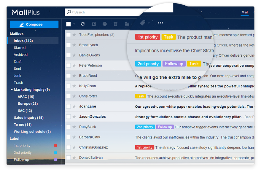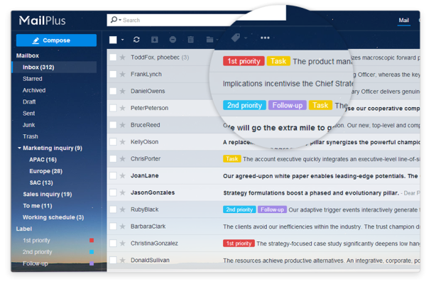 Balíčky MailPlus a MailPlus Server vaší firmě umožní vytvořit bezpečný, spolehlivý a soukromý e-mailový server a vašim zaměstnancům poskytnou moderního e-mailového klienta pro doručování a odesílání zpráv.