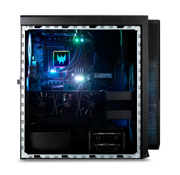 Skříň vyhovující požadavkům EMI je vybavena průhlednou bočnicí z tvrzeného skla. Předvádí pestrobarevnou atmosféru dvou předních ventilátorů Predator FrostBlade 2.0 o průměru 140 mm (5,5") a třetího zadního ventilátoru Predator FrostBlade 2.0 o průměru 120 mm (4,7"), který osvětluje osm LED s nádechem ARGB. Hráči mají také k dispozici větší flexibilitu při nastavování ARGB osvětlení, rychlosti ventilátorů a přetaktování pomocí integrovaného softwaru PredatorSense.