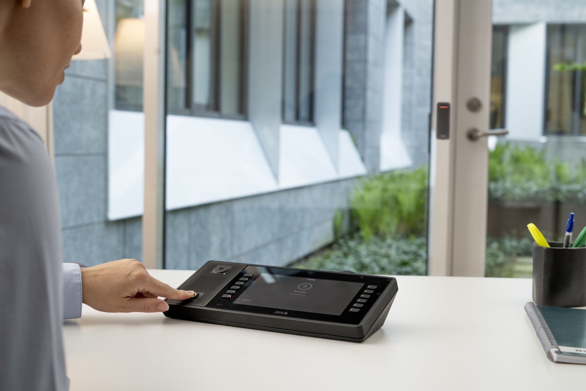 Konzoli lze umístit na stůl nebo ji připevnit na zeď – vestavěný mikrofon jasně zachytí řeč v obou polohách. Při umístění na stůl lze ke konzoli přidat externí sluchátka nebo mikrofon AXIS TC6901 s husím krkem. Zapnutý mikrofon signalizuje jasně viditelná stavová LED dioda.